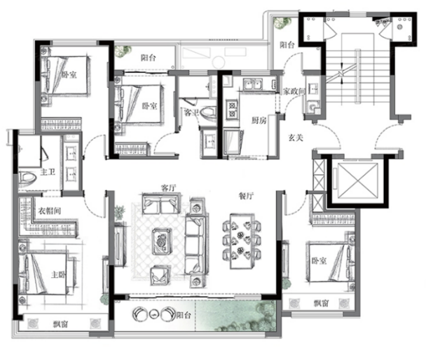 1、建筑立面:以弧线元素、轻盈感、通透性为形象特征,树立项目标志性天津中海天空之镜:项目以弧线元素、轻盈感、通透性为形象特征,与北方常规住宅形象形成反差。客厅及阳台落地窗设计,端户采用弧形飘窗以获得更广的视野,飘窗处通过类幕墙做法,打造简洁纯粹的立面形象。主体线条选用银灰色铝板搭配古铜色金属勾边,同时在线条端头将古铜色线条进行放大处理,以提升建筑层次感与精致度。同时对影响幕墙效果的空调室外机和通风口等进行隐蔽处理,实现更纯净的视觉效果。2、园林景观:项目结合天然高差,打造“一园九境”立体园林及全维生活场域成都华润置地天府九里:天府九里占地近百亩,由1栋中式建筑、8栋小高层、10栋高层呈环抱之势布局。项目依托锦江生态带得天独厚的自然景观资源,将东方美学理念与现代主义设计语言融合,结合项目天然高差现状,将园林划分为“一园九境”,打造自由营地、水岸客厅、草坪聚场、一公里公园漫步道等社交功能区,全龄儿童场地、亲子会客厅、趣味轮滑、生物花园等亲子功能区及羽毛球场、乐活健身、健康跑道等健康功能区,9大主题场域满足全年龄段业主休闲娱乐需求。3、精装设计:提升精装细部节点标准,全屋精装人性化升级,致力项目高品质交付中建东孚:发布典型三十处精装细部节点标准图,致力项目高品质交付。如玄关设计上,升级鞋柜功能性,增加了通风透气孔和智能鞋柜除菌机。玄关处的可视对讲增设“天使之眼”功能,在家即可查看老年人活动区、儿童活动区等重点区域视频监控画面;客厅设计上,将大平层横厅设计植入小户型中,客餐厅并排朝南,采光更充沛。客厅无主灯设计,业主可自定义氛围灯光,门扇高度与吊顶下边缘齐平,简洁大气;厨房设计上,按烹饪动线布置设备及台面,且台面设计防水条。墙面设计方形金属浅凹槽,隐蔽插座不占用空间;卫生间设计上,沿墙面设置通长排水沟,不积水又防滑。将镜柜下方设计为开放式隔板,方便收纳且美观。洗手盆和马桶离地设计,便于清洁。4、户型设计:146平户型打造南北4阳台,室内洄游动线设计,灵活演绎多重生活场景嘉兴万科光年里:146平户型四室朝南,南向面宽达约13.9米。项目结合当地人居习惯,打造南北4个阳台,北向规划出与家政间形成一体的生活阳台、与北卧相连的休闲阳台,兼具功能性及实用性。厨房采用双洄游动线设计,且规划有“家政间-厨房-餐客厅”与“餐客厅-卧室”两条独立动线,可以根据实际需求切换“归家模式”。餐客厅联动设计,面宽达到6.8米。主卧面宽3.9米,附有270°采光飘窗、衣帽间及双台盆独立明卫。招商保利臻悦项目位于合肥包河区南二环与西递路交口,由招商蛇口&保利发展联合开发,项目占地面积约4.5万平,建筑面积约15.8万平,容积率2.5,全案规划10栋17-25F小高层及高层住宅,共864户,主力户型为121-187平三至四居。建筑立面上,项目在传统公建化立面的基础上,最大化提升项目窗墙比,采用浅色配色,搭配金顶格栅造型,在楼体两侧镶嵌了流金线框,并辅以一些弧度元素,提升项目辨识度。景观设计上,项目将“有限社交”理念融入社区景观构造之中,通过“化整为零”的设计手法,打造多组团、多空间的景观结构,七大植物主题园分散式设计,同时构筑点状式小范围交互空间。架空层以主题式、分散化呈现,尊重业主生活兴趣爱好,且保障不同群体之间的私密性和边界感。景观组团以“多、小、精”的原则规划,在各组团内预留出小范围社交场景。143平四室两厅两卫,户型格局动静分区。进深约9.4米LSDK通厅,将“玄关、餐厅、客厅、阳台”垂直舒展,空间开阔,提升通风及采光效果。南向开间约6.4米联动阳台,可盛载休闲、运动与家政等功能。进深约8.8米套房主卧,南北双面采光,卫浴、飘窗、衣帽间(预留空间)全功能设计,实用性强。