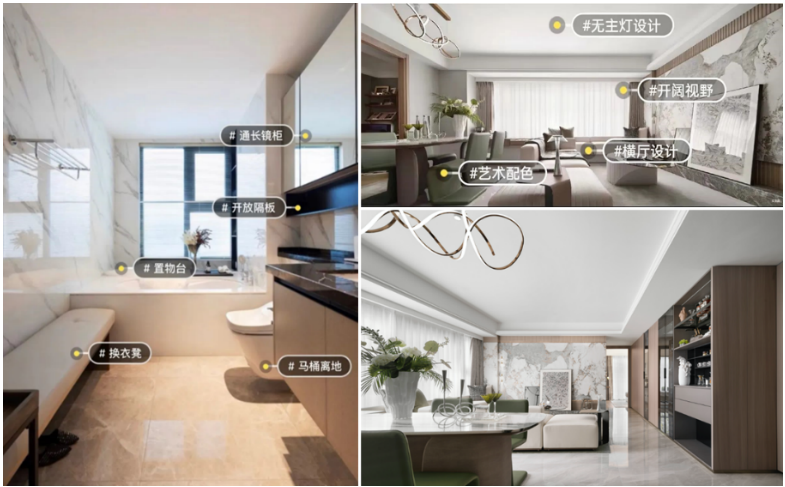 · 从成交套数占比变化上看,与2022年1-4月相比,2023年1-4月30个代表城市中有19个城市90平以下产品成交套数占比下降,16个城市120平以上产品成交套数占比提升,其中一二线城市为12个。· 从热点城市成交结构看,2023年1-4月,北京90平以下产品成交套数同比下降5.3%,90-200平产品成交套数同比增长45.0%;苏州90平以下产品成交套数同比下降20.8%,90-200平产品成交套数同比增长16.5%;东莞90平以下产品成交套数同比增长30.5%,90-200平产品成交套数同比增长69.4%。· 4月22日,华发股份发布“优+产品体系5.0”,以“三力十二优”为基石,打造七大质美生活场景模块。· 4月,中天美好集团发布全新品牌主张——“质感生活家”,围绕“温度、空气、声音、阳光、水、运动”六大生活关注点,推出“健康悦居”体系。中国铁建以“美好生活建造者”为品牌定位,形成了“西派系、国际系、语系”等多元化住宅产品体系,持续为城市和客户创造健康高品质人居环境。· 建筑立面:天津中海天空之镜项目以弧线元素、轻盈感、通透性为形象特征,与北方常规住宅形象形成反差。· 园林景观:成都华润置地天府九里项目依托锦江生态带得天独厚的自然景观资源,打造“一园九境”立体园林及全维生活场域。· 精装设计:中建东孚提升精装细部节点标准,全屋精装人性化升级,致力项目高品质交付。· 户型设计:嘉兴万科光年里项目146平户型结合当地人居习惯打造南北4个阳台,室内规划洄游动线,灵活演绎多重生活场景。招商保利臻悦项目位于合肥包河区,规划10栋17-25F小高层及高层住宅,全案共864户。建筑立面上,项目在传统公建化立面的基础上,最大化提升窗墙比。园林景观上,项目将“有限社交”理念融入社区景观构造之中,通过“化整为零”的设计手法,打造多组团、多空间的景观结构。户型设计上,143平四室户型动静分区,LSDK通厅进深约9.4米,南向联动阳台开间约6.4米,主卧套房进深约8.8米,尺度阔绰。