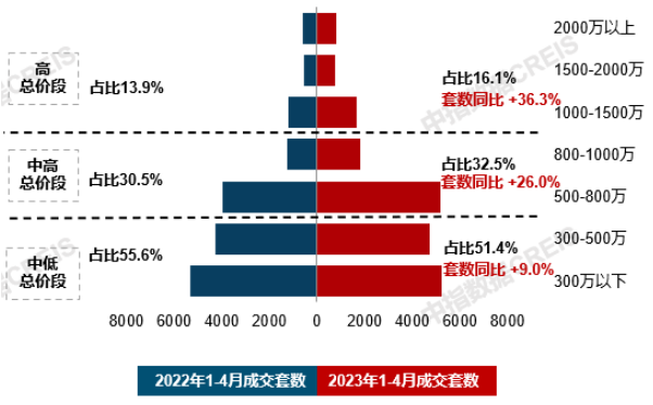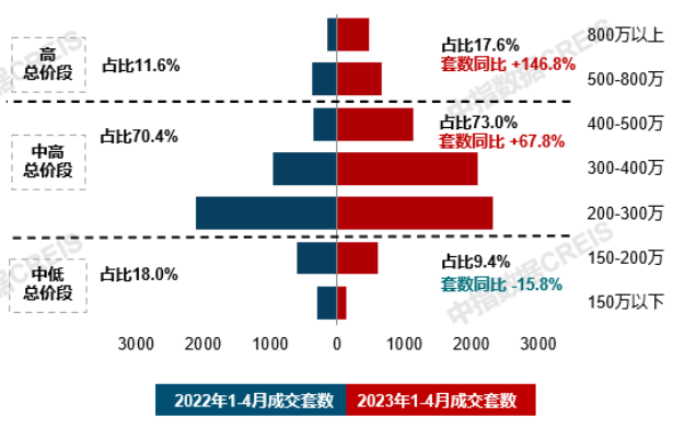 从成交面积结构看,2023年1-4月苏州90平以下刚需型产品成交885套,同比下降20.8%,成交套数占比5.2%,较2022同期下降2.4个百分点。90-200平产品成交15177套,同比增长16.5%,成交套数占比89.7%,较2022年同期上升1.1个百分点。200平以上大户型产品成交858套,成交套数占比提升至5.1%。从成交总价结构看,250万以下产品成交套数占比34.5%,较2022年同期下降7.7个百分点。250-600万产品成交套数占比较2022年同期提升1.4个百分点。600万以上产品成交套数占提升至11.7%。数据来源:中指数据CREIS(点击查看)