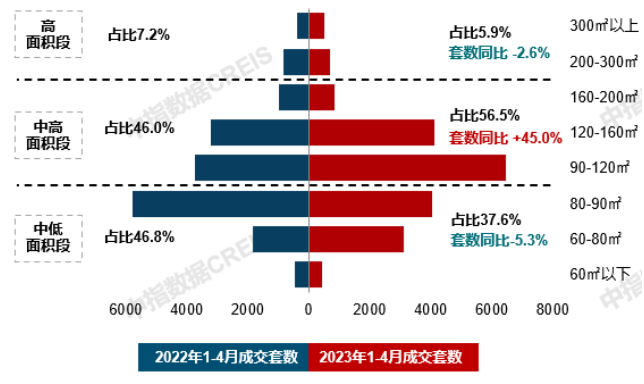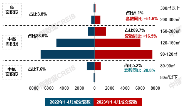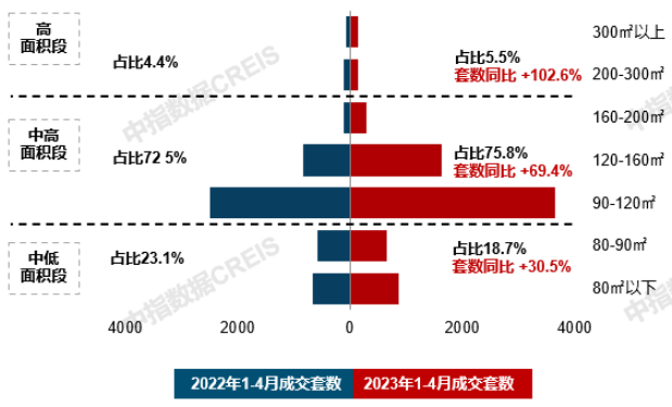 从成交套数占比变化上看,与2022年1-4月相比,2023年1-4月30个代表城市中有19个城市90平以下产品成交套数占比下降,16个城市120平以上产品成交套数占比提升,其中一二线城市为12个。