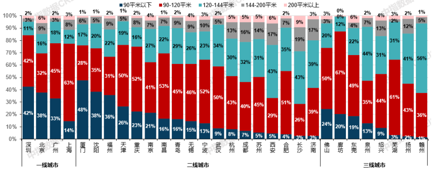 图:2023年1-4月30个代表城市各面积段住宅销售套数占比数据来源:中指数据CREIS(点击查看)