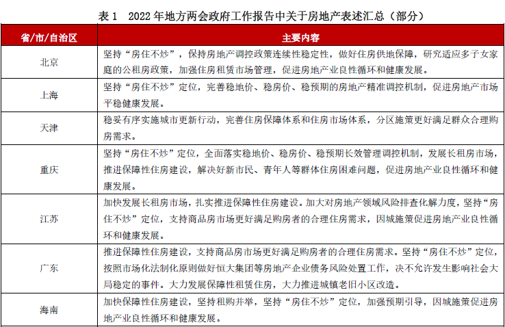 2月28日,郑州市拟定关于促进房地产业良性循环和健康发展19条新政,成为春节后首个出台相对全面“稳楼市”政策的二线城市。这也从侧面反映出当前弱二线、三四线城市房地产市场依然面临较大的下行压力,后续房地产政策松动城市或将由三四线延展至库存积压严重、下行压力较大的二线。同时,政策松绑力度有望加大,包括“限购、限售、限贷、限价”结构性调整、个人购房信贷投放和房企金融贷款支持甚至是重启棚改货币化安置等政策或将被更多城市沿用。同时,从2022年地方两会政府工作报告来看,超半数省份均提出要加快发展长租房市场、加强保障性租赁住房建设等,围绕住房租赁行业的支持类政策和监管类政策也有望得到进一步完善。