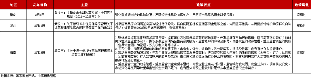 紧缩性调控主要表现在市场监管政策上,如重庆市发布金融改革发展“十四五”规划,强调强化重点领域金融风险防范,严禁资金违规投向房地产;海口市进一步加强商品房预售资金监管,重点监测资金的动态管理等。