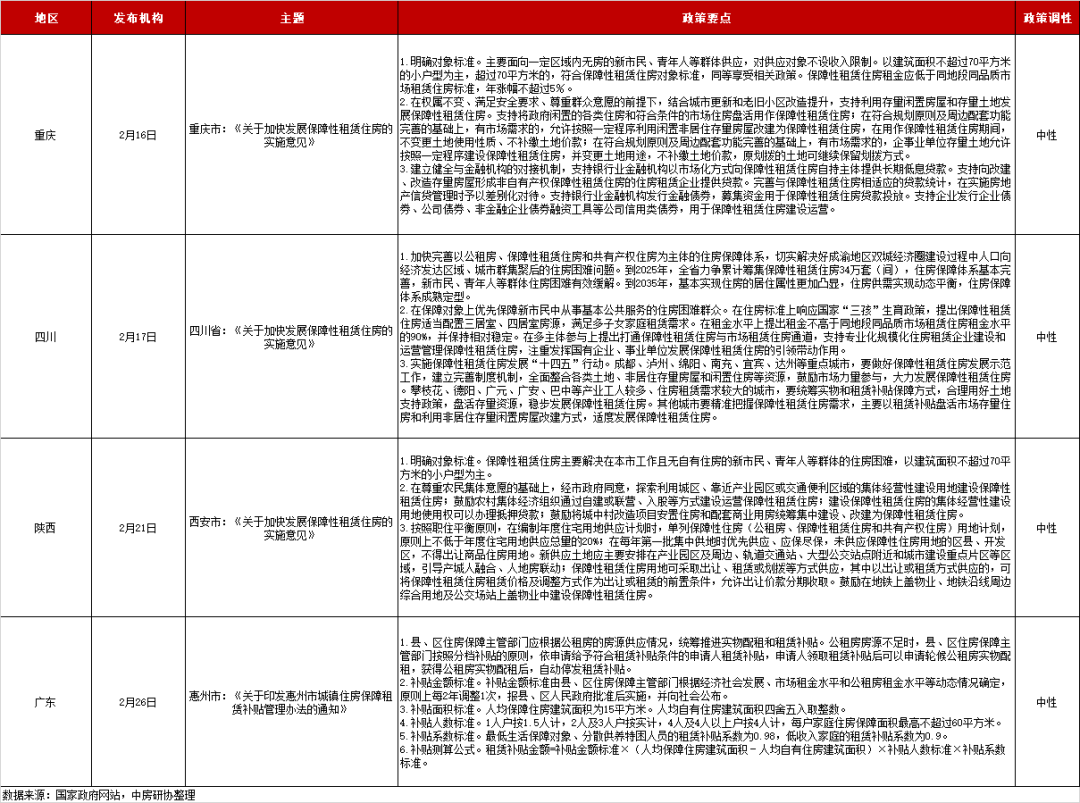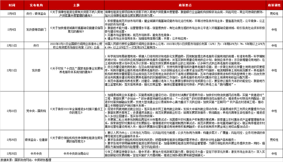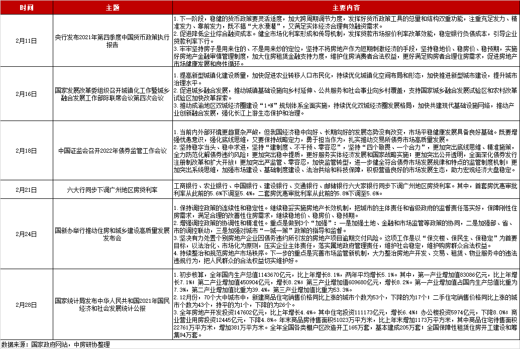 2月,房地产政策环境持续改善。中央层面,在坚持“房住不炒”定位和“稳地价、稳房价、稳预期”目标不变前提下,国新办在推动住房和城乡建设高质量发展发布会中提出保持调控政策的连续性和稳定性、增强调控政策的协调性和精准性、坚决有力处置个别房地产企业因债务违约所引发的房地产项目逾期交付风险、持续整治和规范房地产市场秩序等2022年调控重点工作。同时,明确提出要保障刚性住房需求,满足合理的改善性住房需求,加快保障性租赁住房建设等。央行、银保监会、住建部等部门发文强调,要加强金融机构对保障性租赁住房发展的支持力度,并明确保障性租赁住房有关贷款不纳入房地产贷款集中度管理。