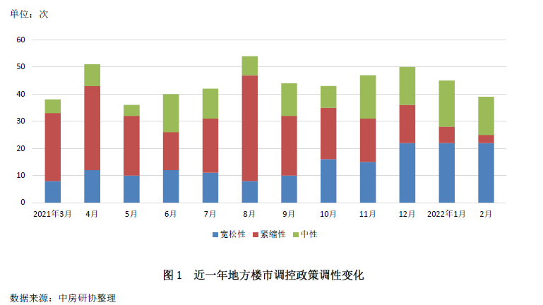 中房研协测评研究中心监测统计,2022年2月地方出台房地产调控政策39条,较上月略有减少。其中,宽松性政策22条,中性政策14条,紧缩性政策3条。宽松性政策数量占调控政策总数比重达56.4%,较上月进一步扩大,紧缩性政策占比由上月的13.3%进一步缩减至7.7%。地方房地产政策环境持续改善。