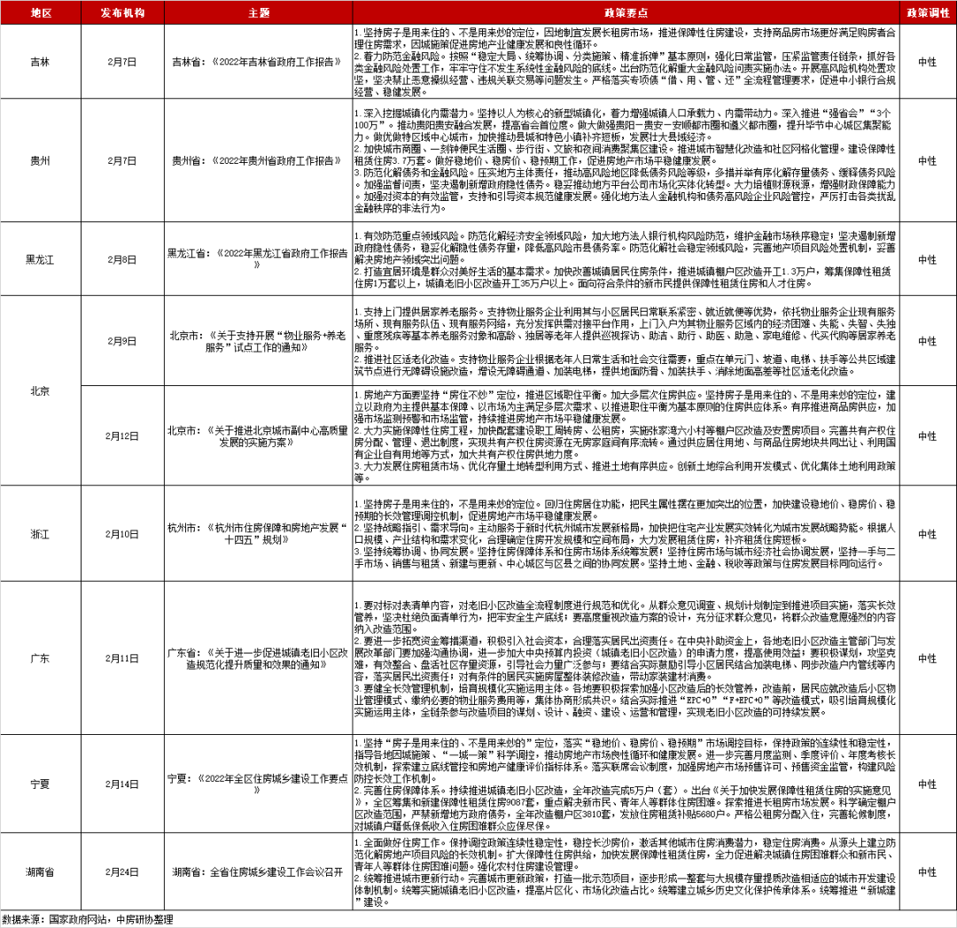 地方层面,本月地方出台房地产调控政策数量较上月小幅减少。其中,宽松性政策占比较上月继续扩大至56.4%,紧缩性政策占比较上月继续下滑至7.7%,地方房地产政策环境持续改善。从调控内容来看,降低首付比例、提高公积金贷款额度、发放购房补贴等成为地方为楼市纾困的主要手段。此外,地方两会相继结束。从2022年地方政府工作报告来看,坚持“房住不炒”定位、发展长租房市场、推进保障性租赁住房建设、推进城市更新工作、因城施策促进房地产业良性循环和健康发展等成为地方关于房地产表述热词。本期报告主要对2月房地产行业政策进行梳理,并作解析。