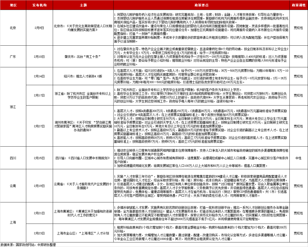 具体来看,宽松性调控主要表现在行政限制、住房公积金政策和人口人才政策支持上。其中,在行政限制方面,典型代表有:延吉市对符合条件的购房农民购买家庭唯一住房发放全额契税补贴和加点消费券、装修材料消费券补贴;重庆、菏泽、佛山、南通等城市部分银行或楼盘将首付比例下调至2成;郑州市提出推行货币化安置、支持居民改善性住房需求、降低个人住房消费负担等19条新政等。在住房公积金政策方面,典型代表有:衢州市将家庭住房公积金贷款上限提至100万元,个人住房公积金贷款上限提至60万元;南宁市将首套房公积金贷款首付比例下调至20%,贷款额度最高70万,二套房首付比例最低30%,贷款额度最高60万元;遂宁市将二孩、三孩职工家庭住房公积金贷款最高额度上限提高5万元,即单缴存职工家庭最高可贷40万元,双缴存职工家庭最高可贷45万元;达州市将夫妻双方缴纳公积金贷款上限提升至60万元,夫妻一方或单身缴纳公积金贷款上限提高至50万元;晋中市将家庭购买二套改善性住房公积金贷款首付比例下调至20%,贷款最高额度上提至80万元等。在人口人才政策方面,典型代表有:绍兴市对引进的A-E类人才,给予9万-100万安家补贴、35万-500万房票补贴等,对引进的硕博士和本科毕业生,给予3万-9万安家补贴、3万-35万房票补贴等;浙江省除杭州市区外,全面放开专科以上学历毕业生落户限制,并为高校毕业生提供2万-40万的生活补贴或购房租房补贴及创业贷款支持等;湖州市南浔区对A-E类人才,给予50万-300万元房票奖励,对全日制博士、硕士、本科毕业生、大专毕业生给予7万-50万元房票奖励等;上海市金山区将租房补贴由1个档次增加至7个档次,最高可享全额租金补贴,购房补贴由1个档次增加至3个档次,最高可享200万元补贴,上海市黄浦区将每年人才发展资金规模由不超过5000万元提高至不低于1亿元等。