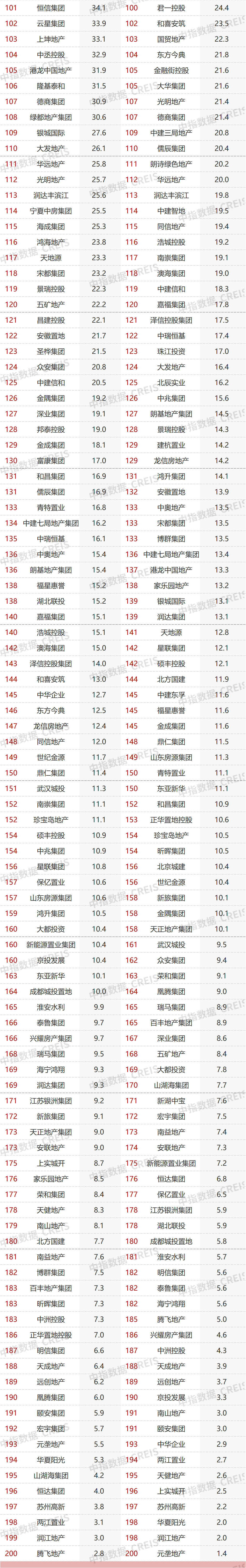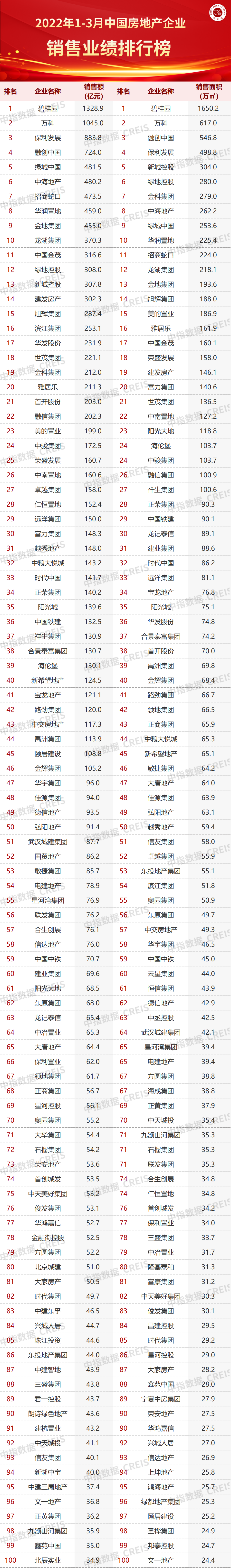 特别声明:房地产企业销售数据统计是以2022年1月1日-3月31日期间销售的并表商品房为统计口径,主要依据中指数据CREIS(点击试用)在各地的销售监测数据,并参考当期总体经营情况和推盘去化情况进行分析统计;对于少数没有在监测范围内的城市或项目,由企业提供相关证明文件,经课题组对数据进行严格审核,也纳入统计范围。本报告仅供参考,课题组不对使用报告及其内容所引发的任何直接或间接损失承担责任。