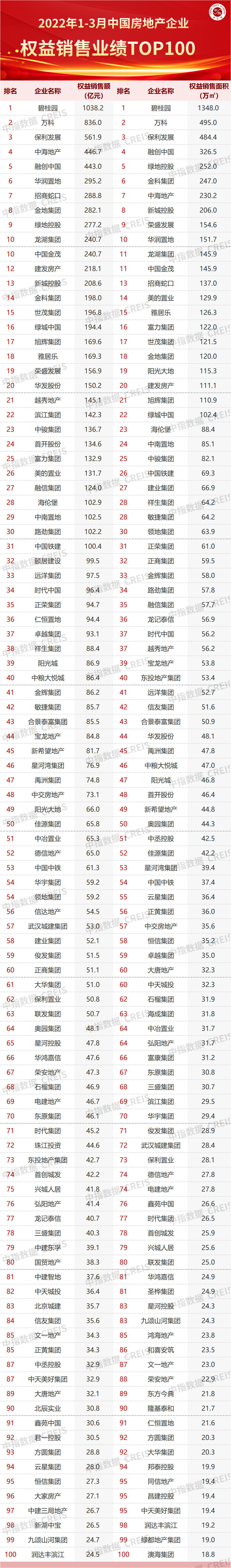 特别声明:房地产企业权益销售数据统计是以2022年1月1日-3月31日期间按股权比例销售的商品房为统计口径,主要依据中指数据CREIS(点击试用)在各地的销售监测数据,并参考当期总体经营情况和推盘去化情况进行分析统计;对于少数没有在监测范围内的城市或项目,由企业提供相关证明文件,经课题组对数据进行严格审核,也纳入统计范围。本报告仅供参考,课题组不对使用报告及其内容所引发的任何直接或间接损失承担责任。