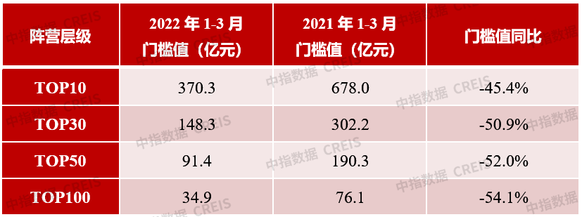 2022年1-3月,TOP100门槛值为34.9亿元。其中,TOP10房企门槛值为370.3亿元,较上年下降45.4%;TOP30房企门槛值为148.3亿元,较上年下降50.9%;TOP50房企及TOP100房企门槛值分别为91.4亿元和34.9亿元,同比分别下降52.0%和54.1%。