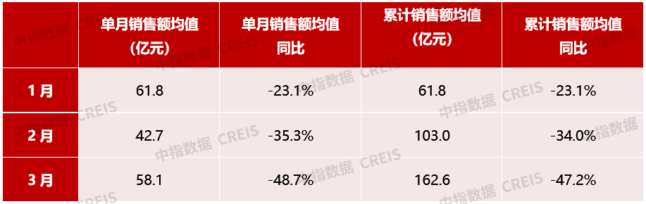 2022年1-3月,TOP100房企销售额均值为162.6亿元,同比下降47.2%;其中销售额超千亿房企2家,较去年同期减少3家;超百亿房企46家,较去年同期减少30家。TOP100房企权益销售额均值为119.5元,权益销售面积均值为85.1万平方米,同比分别下降47.6%和48.1%。