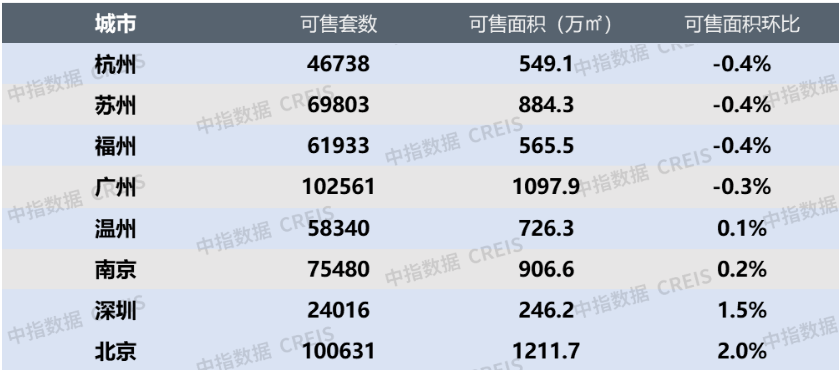 监测的8个代表城市整体库存环比上升0.31%。库存环比下降的城市中,杭州、苏州、福州降幅最大,为0.4%;广州次之,为0.3%。监测城市中,北京升幅最大,为2%。