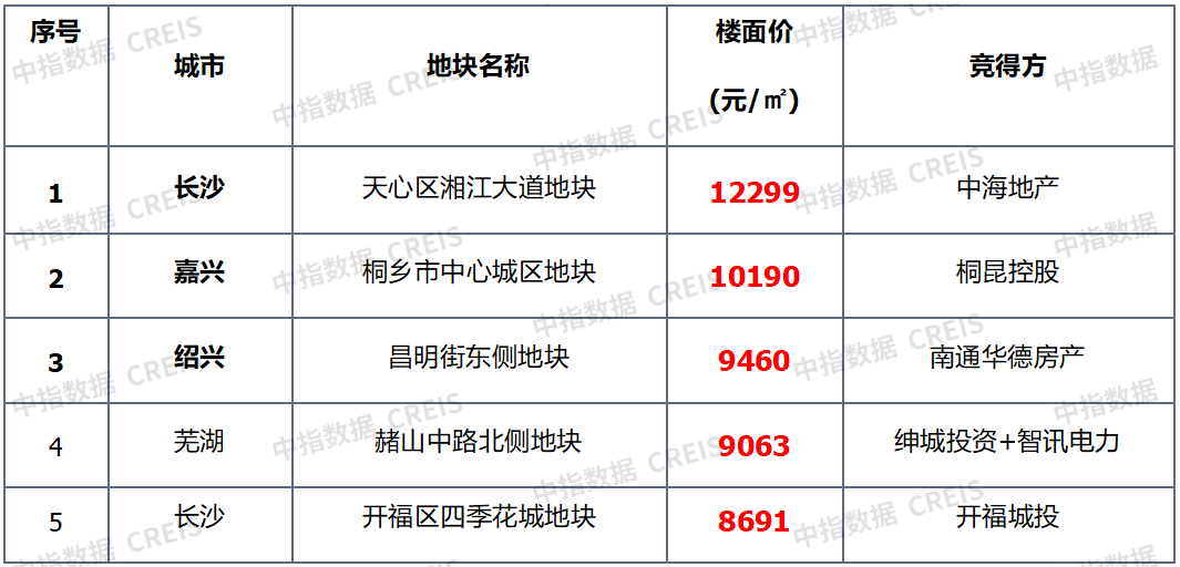 ▌宅地单价TOP5:榜单均价环比微跌,长沙天心区宅地居首