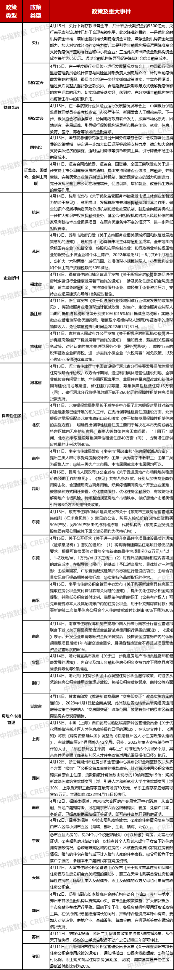 表:本周(4月11日~4月17日)房地产市场重点政策及事件汇总