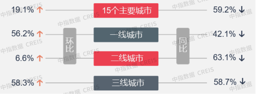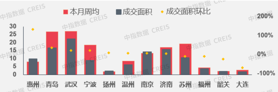 图:二三线重点城市成交面积环比涨跌幅数据来源:中指数据CREIS