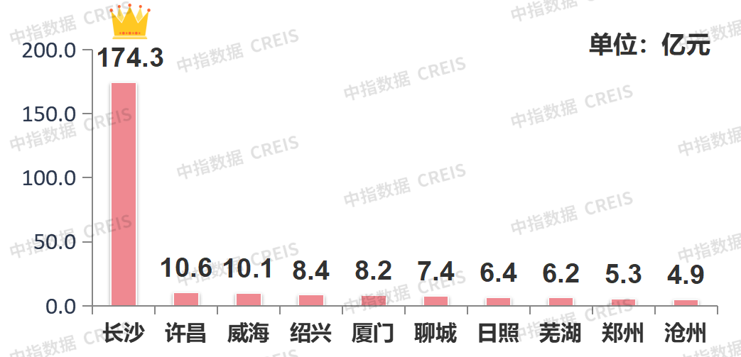 榜单总额较上周上扬,入榜门槛升至10.7亿元,长沙占据榜单四席,长沙天心区宅地收金近32亿元领衔。