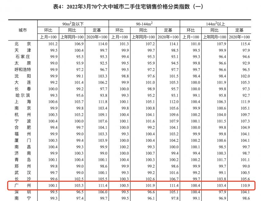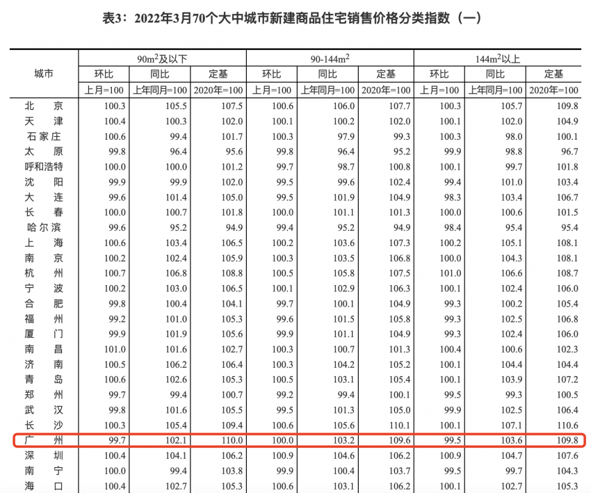 据公告,2022年3月,广州新建商品住宅销售价格整体环比下降0.1%,同比上升3.0%,定基上升9.7%。其中,90m²及以下的新建商品住宅销售价格环比下降0.3%,同比上升2.1%,定基上升10.0%;90-144m²的新建商品住宅销售价格环比持平,同比上升3.2%,定基上升9.6%;144m²及以上的新建商品住宅销售价格环比下降0.5%,同比上升3.6%,定基上升9.8%。