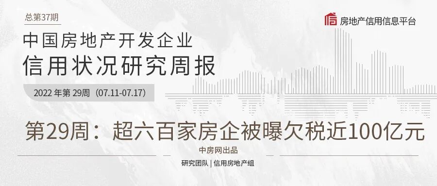 其中,本周(7.11-7.17)共增加房地产开发企业各类不良信用信息2579条,涉及房地产开发企业845家。从类型来看,本周新增的不良信用信息主要是欠税信息,其次是经营异常、行政处罚、失信被执行人和严重违法失信信息,本周无重大税收违法信息。从分布来看,江苏、湖北和安徽本周房企不良信用信息最多。