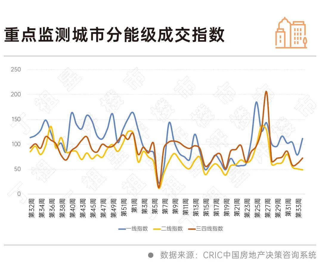 重点监测城市8月至今的成交指数来看,一线城市成交指数为111.65,环比增长33.08;二线城市成交指数为48.94,环比下降2.02点;三四线城市成交指数为72.25,环比增长10.83点。