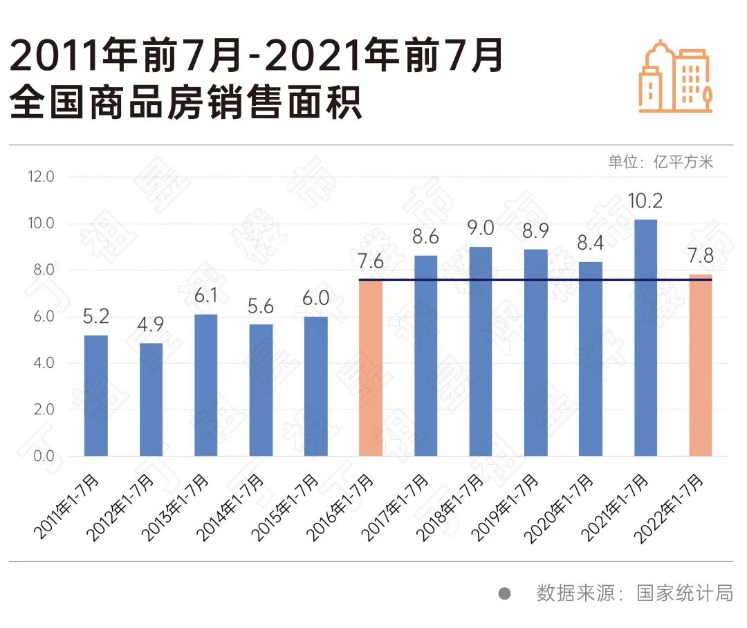 2021年下半年以来,房地产行业进入深度调整期,对比近10年前7月全国商品房销售面积,2022年前7月商品房销售面积7.8亿平方米,与2016年前7月7.6亿平方米相差无几。预计2022年全年商品房销售面积也或将略高于2016年。