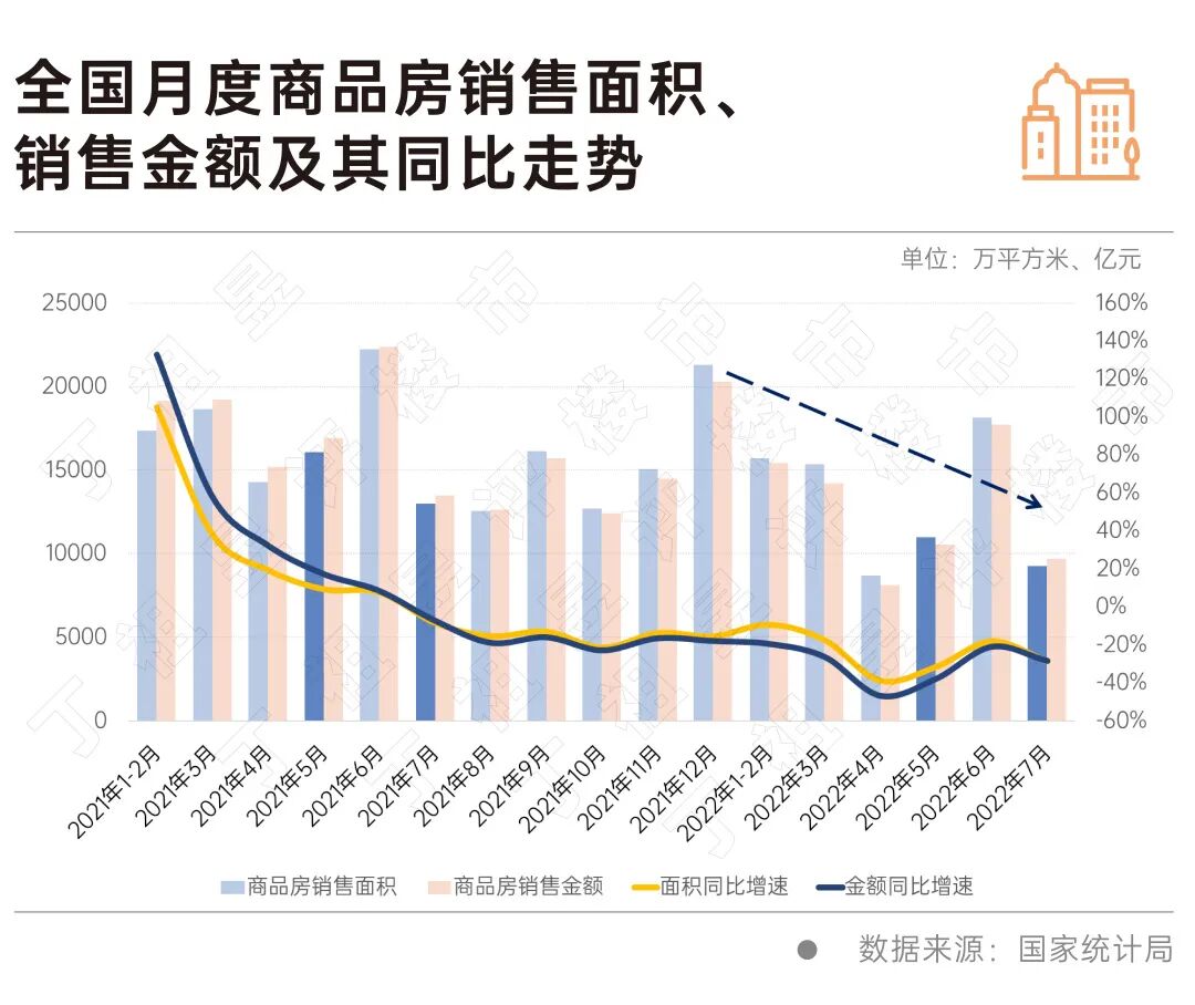 然而稳地产政策效果并不明显,国家统计局数据显示,7月商品房销售规模在年中高增后回落。7月全国商品房分别销售9255万平方米和9691亿元,环比下降均超四成,较5月分别下降16%和8%;同比则分别下降29%和28%,较6月降幅分别扩大了10pcts和7pcts。