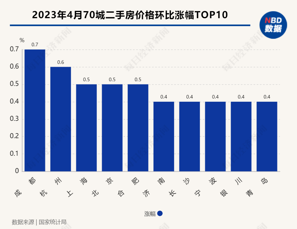 5月17日上午,国家统计局发布的《2023年4月份70个大中城市商品住宅销售价格变动情况》显示,4月份62个城市新房价格环比上涨,但涨幅均未超过1%;36个城市二手房环比上涨,最高涨幅达到8.7%。